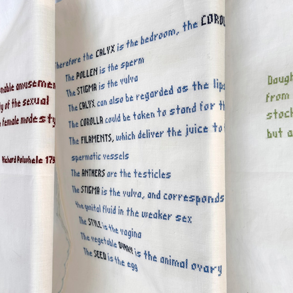 Working from her narrowboat, she is has just submitted her PhD research in Fine Art and History, entitled Phallic Metaphors and Feminist Perspectives: Unsettling the Linnaean Botanical Archive through Historiographic Technique and Studio Practice. Her question, simply put, asks how the eighteenth-century system of categorising plants developed by Carl Linnaeus, which described flower structures in terms of the human body, and aligned plant reproduction with the marriage bed, reflected and reinforced the elite social culture of the era?